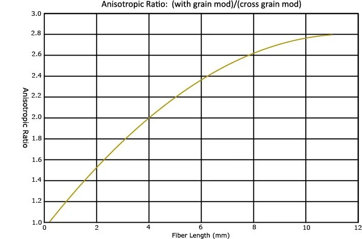Longer fibers, randomly oriented, create more tensile modulus (strength). In the case of oriented fibers, more modulus is realized in the "machine direction" (with the grain) of the polymer matrix. See anisotropic chart above.