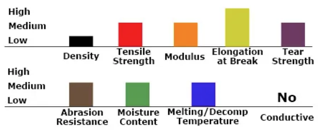 Nylon is characterized by its dimensional stability, relative high melting point, high tensile strength, abrasion resistance, chemical stability, tear and cut strength and light weight making it popular for use in an array of industrial and consumer products. Nylon fiber is considered a performance engineered thermoplastic.